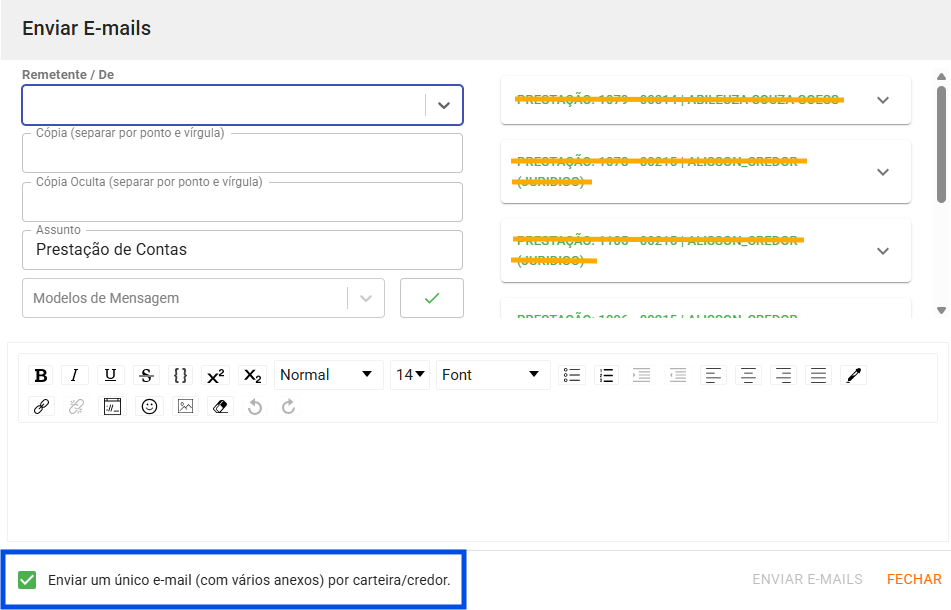 Agora ao selecionar várias prestações de contas de uma mesma carteira/credor, é habilitado uma opção para enviar um único e-mail (com vários anexos) por carteira/credor.